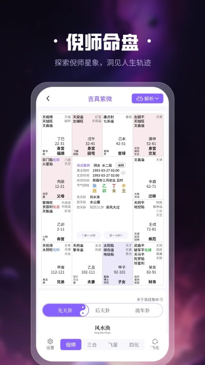 内置“先天卦、后天卦、流年卦”三大模块,深度还原倪海厦老师紫微斗数体系,为专业用户提供更精准的流年运势分析。