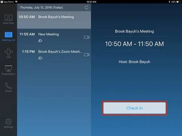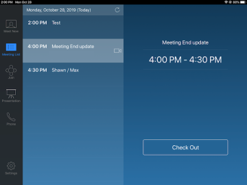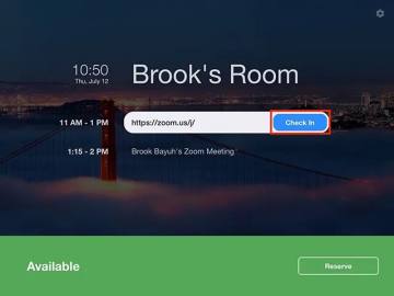 点击控制器上的签入,确认您已进入会议室。如果已安排会议是Zoom 会议,控制器将显示开始而非“签入”。