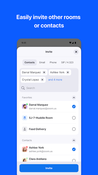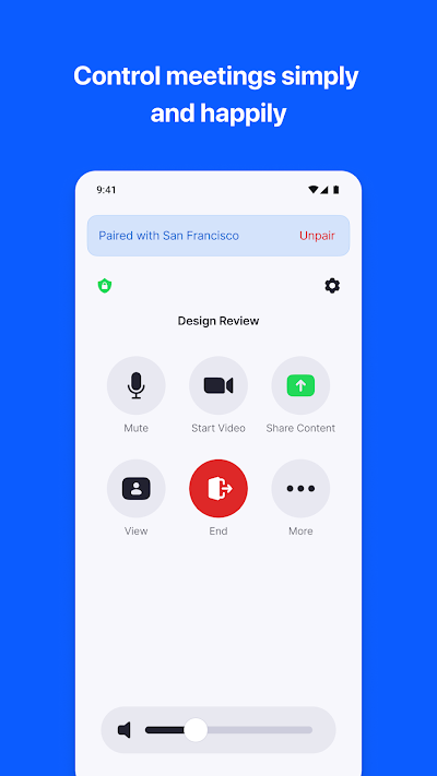 支持通过用户的个人智能手机或平板电脑与Zoom Rooms设备配对,实现远程控制会议的启动、静音、共享、结束等操作,使用灵活方便,尤其适合混合办公场景。