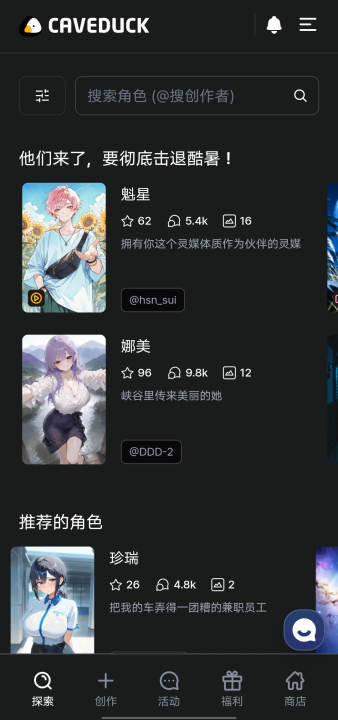 CaveduckAI聊天最新版是一个无禁词的AI角色聊天互动软件,用户可以自由设计AI角色的外观和个性,支持多种语言还有自动翻译功能,通过强大的AI模型让角色能理解用户意图并生成自然回应,支持深度对话和情感交流,还有多样化的AI角色库可以根据标签筛选!