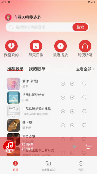 车载 DJ 嗨歌多多 app 在资源与功能上高度适配用户需求。曲库方面,不仅涵盖海量热门歌曲,还包含搞笑、性感、欧美、日韩等多种风格,能满足不同用户的多样化音乐偏好;更新速度快,确保用户及时获取最新音乐资源。功能上,除基础的听歌、歌单创建与曲目收藏外,还支持音乐搜索、离线下载、用户交流社区互动等,搭配智能算法推荐功能,可根据用户听歌习惯推送可能喜欢的歌曲,提供个性化体验。同时,软件全程无付费,操作门槛低,无论是日常通勤还是长途驾驶,都能为用户带来便捷、优质的音乐享受。