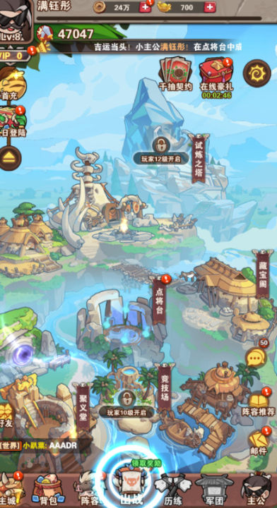 1、主界面: 找到你的资源田(石头、木头、肉?果子?)、武将列表、挂机收益按钮(最重要!)、任务/活动入口。