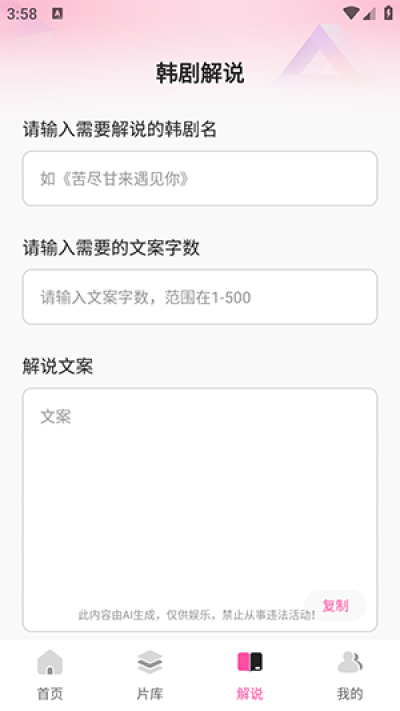 3、如果要进行韩剧解说,可以直接输入要解说的韩剧名、文案字数以及解说文案内容,就可以立即生成。
