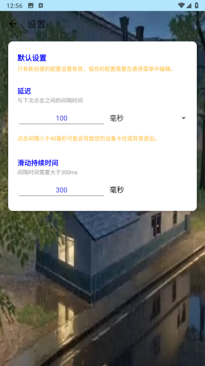 2、点击设置可以对延迟和持续滑动时间进行调节。