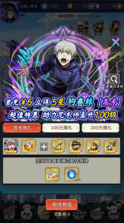 首周登录赠送5星咒术师,第二周赠送超强五条悟!