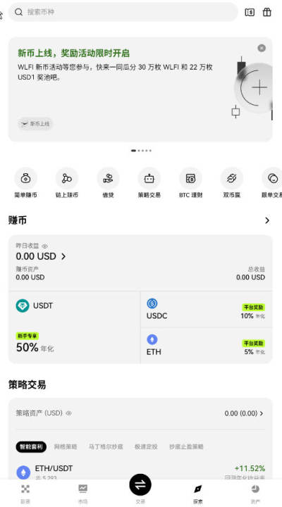 进入“赚币”专区,选择“ETH 2.0质押”,年化收益率约5%,支持随时赎回。