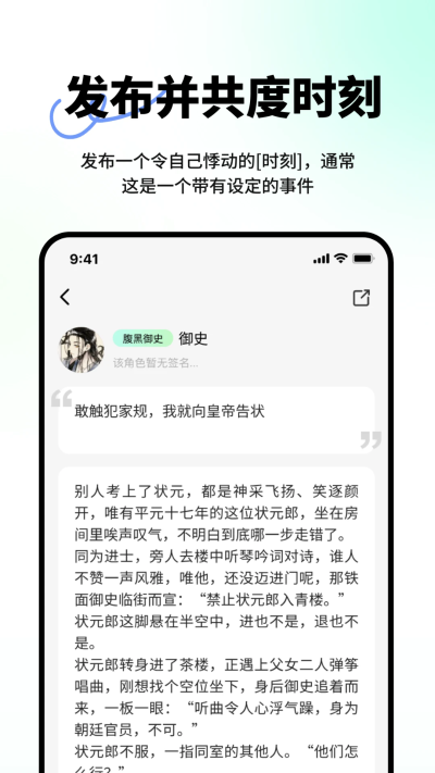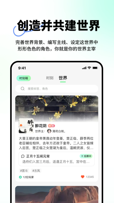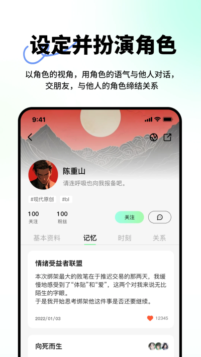 创建一个想要扮演的角色,可以原创或来自其他作品的同人,你将为自己的角色设定身份、性格、外貌等完善角色形象;你会以角色的视角,用角色的语气与他人对话,交朋友,与他人的角色缔结关系;