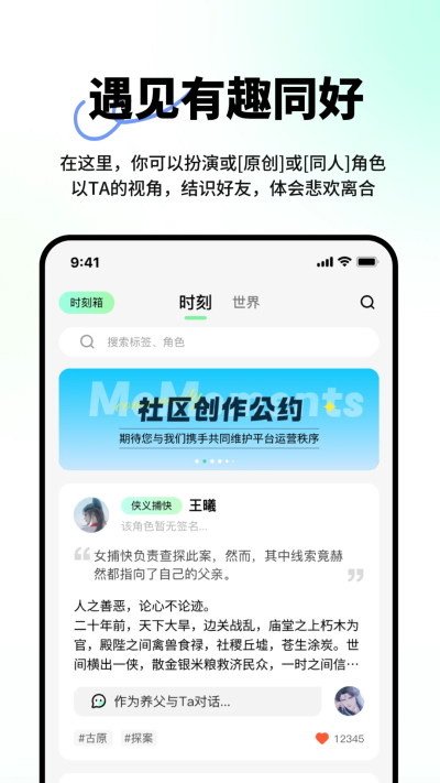 觅梦app是一款手机免费角色扮演类应用,在这里遇见有趣同好,你可以扮演或原创或同人的角色,以不同的视角结交好友开启聊天对话,体会悲欢离合,创造更多美好光阴!对软件感兴趣的话不妨点击下载试试!