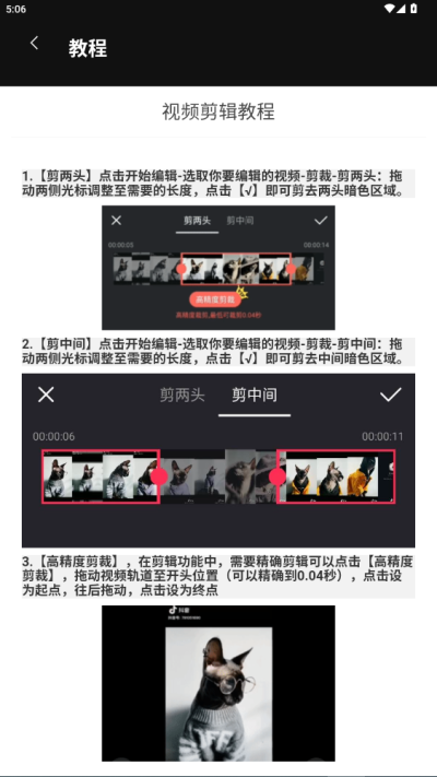 5、在剪辑功能中,如果需要精确剪辑可以点击高精度剪裁,拖动视频轨道至开头位置(可以精确到0.04秒),点击设为起点,往后拖动,点击设为终点。