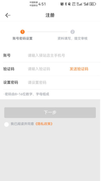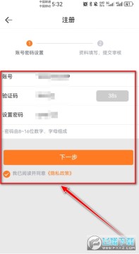 2.先输入自己的手机号码、验证码,然后设置密码,勾选我已阅读并同意《隐私政策》,最后点击下一步。