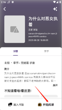 5、点击心仪的漫画进入详情页,查看简介、章节列表与用户评价,确认后点击【开始阅读】按钮。