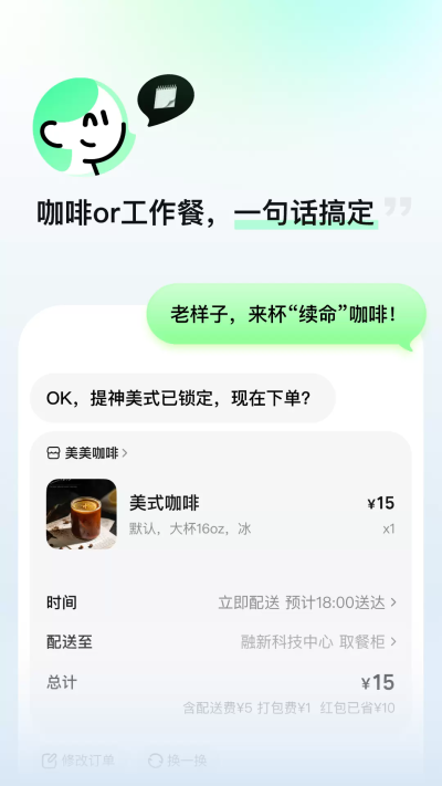 1. 主动帮你安排轻松/有序的日常,每天早上主动帮用户安排一杯咖啡,提醒去健身,一句话“点个外卖”,帮用户安排符合饮食计划的午餐