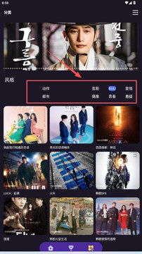 3、点分类选风格,能按动作喜剧等标签筛选,看到播放次数数据。