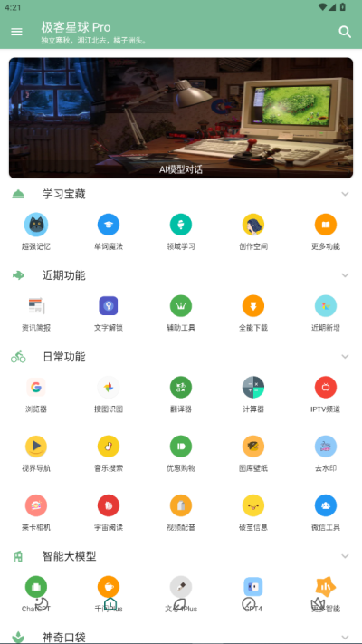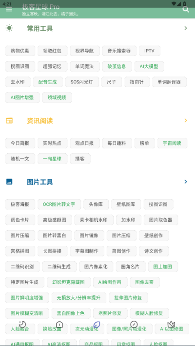 极客星球 Pro 是一款功能强大的手机工具箱软件,致力于为用户提供一站式资源与工具服务。软件内整合了海量软件资源,涵盖游戏、音乐、视频以及各类实用工具等丰富类型,满足用户多场景需求。