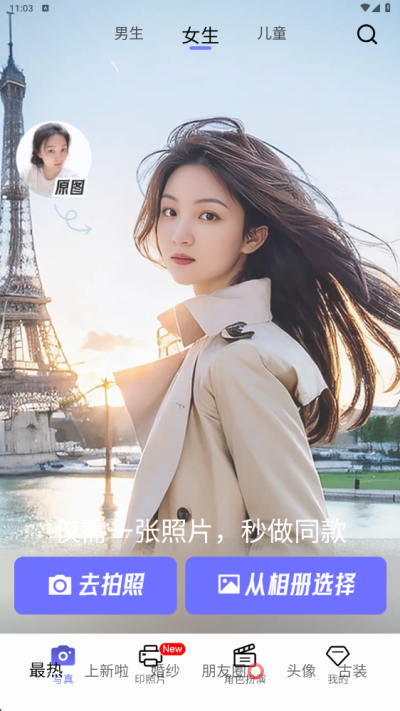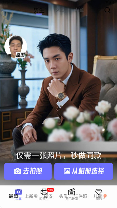2、一键出片,无需专业技巧:操作流程简单易懂,用户仅需上传一张正面照片,选择模板主题,即可一键生成成片,无需复杂的修图步骤,真正实现 “不用出门也能拍写真大片”,降低创作门槛。