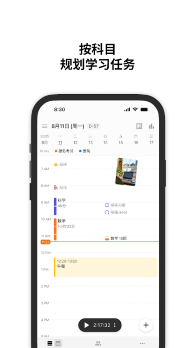 1、科目化秒表计时:支持按科目设置秒表,精准记录各科目学习时间,帮助用户清晰掌握时间分配情况,避免单一科目过度消耗或遗漏学习,实现 “均衡学习”。