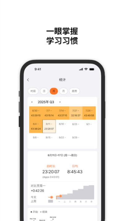 5、习惯培养需求者:希望通过规律学习培养良好习惯(如早起学习、每日固定时长学习)的用户,起床认证、自动记录与日历反馈功能,能助力习惯养成,形成稳定学习节奏。