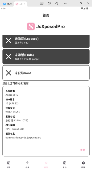3、确保软件主页显示“已激活(Lsposed)”“已激活(Frida)”“已获取Root”状态,同时确认系统版本适配;