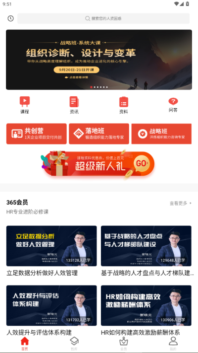 邀请行业名企大咖及资深人力资源从业者授课,结合自身丰富的企业管理经验,针对初创企业生存困境、企业快速发展、组织变革、转型升级等企业发展不同阶段的人力资源管理问题,进行实战分享,让用户汲取实用的管理经验。