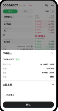 选择【买入】—【限价委托】— 输入【价格】、【数量】—点击【买入DOGE】,确认订单。