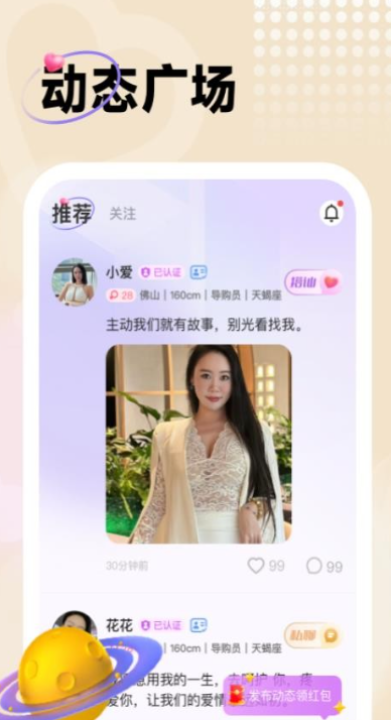 4、动态广场功能:打造专属动态广场,用户可在线浏览其他单身人士发布的精彩动态,包括生活日常、兴趣分享、心情感悟等。通过浏览动态,用户能提前了解他人的生活方式与性格特点,解锁更多有趣的聊天话题,为主动搭讪或回应他人提供方向。