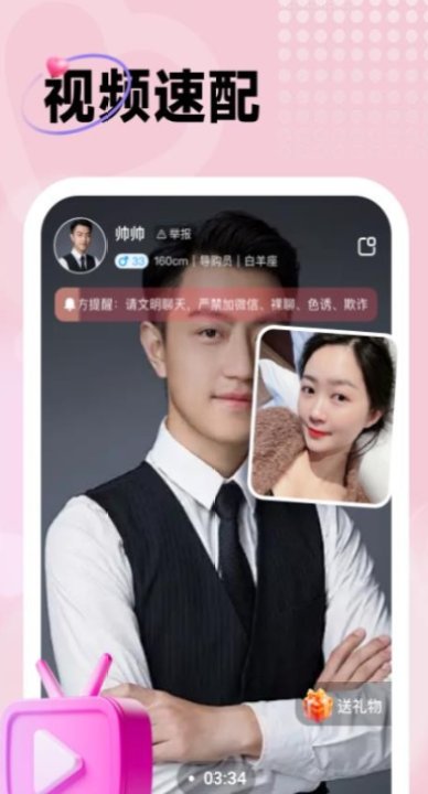 2、视频速配功能:支持用户发起视频聊天速配,打破文字、语音交流的局限,让用户能与匹配对象进行面对面般的实时交流。通过视频直观了解对方的神态、谈吐,提升彼此的了解效率,避免 “见光死”,为后续深入交往奠定基础。