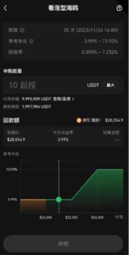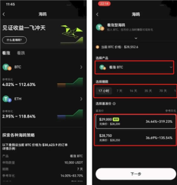 2、先选择方向【看涨/看跌】,然后选择标的币种【BTC/ETH】,最后选择【期限】以及相关的【目标价格,包括基准价和兑换价】