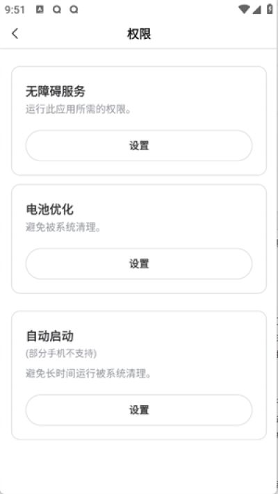 第一步·开启权限:按首页“权限”引导,依次开启无障碍服务与悬浮窗显示;若设备有电池优化,请将应用加入白名单,避免后台被系统回收。