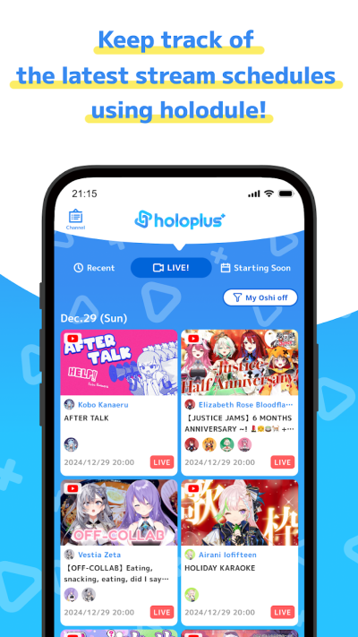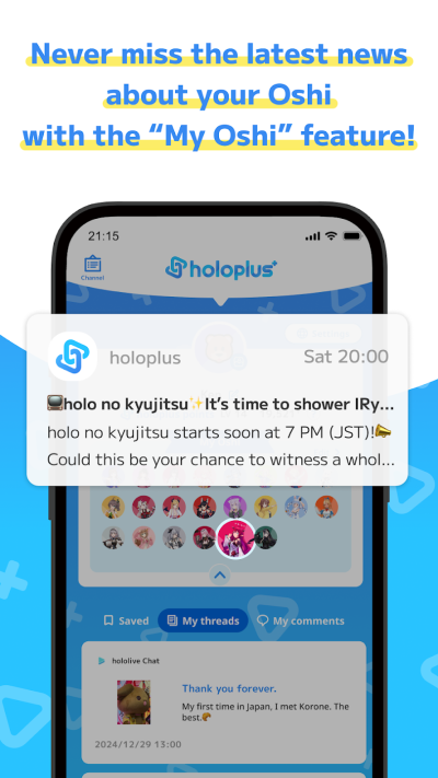 holoplus安卓最新版是一款专为hololive和HOLOSTARS的粉丝打造的粉丝社区软件,软件里用户可以轻松了解hololive最新动态,提供即时的直播时刻表,用户可以查看成员的直播信息,用户可以根据自己的喜好设置只观看自己推的相关消息,打造个性化的使用体验!