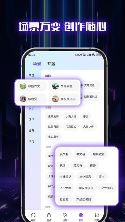 创意辅助功能:内置AI问答系统,实时提供写作建议与信息查询;支持藏头诗生成与绘画功能,拓展创意表达边界。