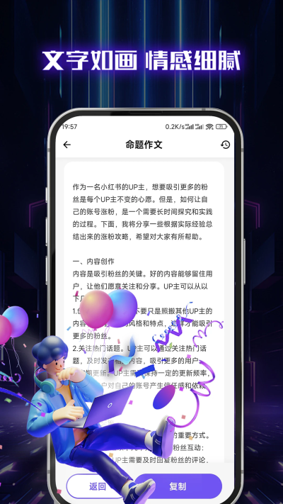 欢迎使用「闪电写作」,你创作灵感的得力助手!无论你是作家、学生、创业者,或是需要创意的个人,「闪电写作」都能为你提供合适的工具和灵感。立即下载「闪电写作」,让你的文字在创作的海洋中自由飞翔,开始你的创作之旅!