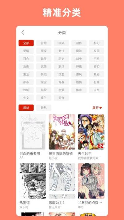 4、分类筛选,提供多种分类标签与筛选条件,包括题材、人气、更新状态等,快速定位心仪漫画。