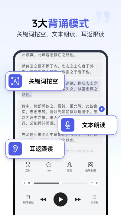 背书匠app会提供挖空记忆、朗读文本、耳返背书等多种背诵模式,用户可以根据喜好选择。