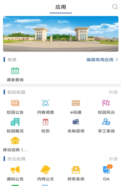 采用扁平化设计,功能模块分类清晰,常用功能(如课表、校园卡余额)置于首页。