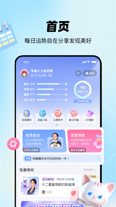 知星官方最新版是一款基于西方占星学的星座社交软件,用户输入出生时间地点后可生成个性化星盘,并解读性格爱情职业等特质,通过对比用户与他人的星盘,分析人际关系中的兼容性及潜在互动模式,通过算法匹配星座契合的用户,支持匿名或实名交友!