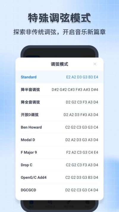 2、调音模式灵活多样:包含标准调音、降调调音及自定义调音选项,可根据不同音乐风格(如流行、民谣)和演奏需求灵活切换,满足多样化的调音场景,适配不同演奏偏好。