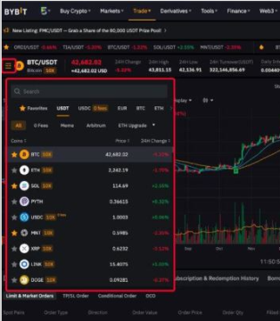 5、注册完成之后,返回首页在页面左侧,将鼠标悬停在交易对旁的下拉选单上,即可查看支持的所有现货交易对,以及相应交易对的最新成交价和 24小时涨跌幅。