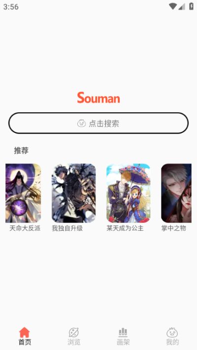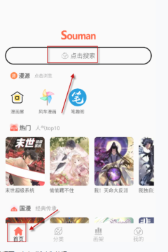 1、下载安装并打开souman后,在“首页”中的点击顶部的搜索栏
