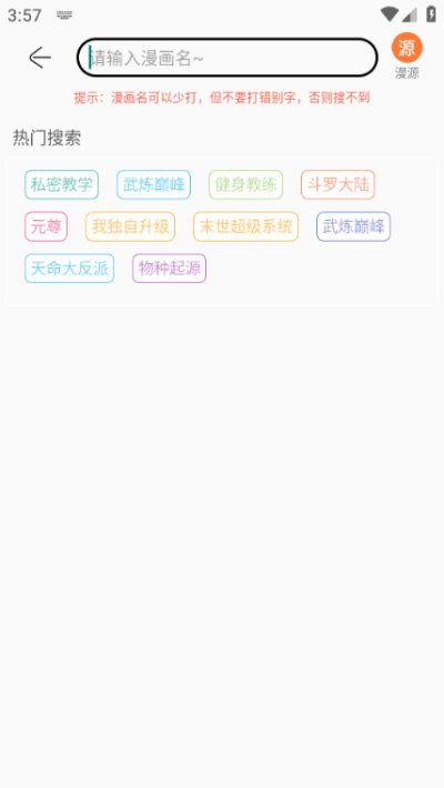 4、在搜索页面搜索栏旁边点击“漫源”就可以进入漫画源切换页面