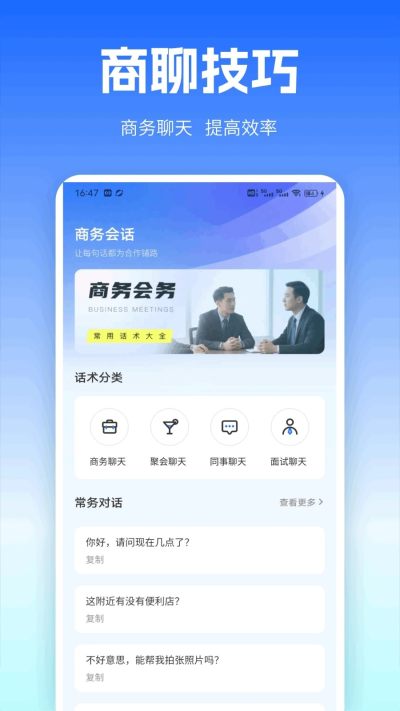 1、商务人士:经常参与谈判磋商、客户维护等商务沟通场景,需要专业话术支持与沟通数据统计的商务人士,软件的商务会话模板与数据统计功能,能提升沟通专业性与效率。