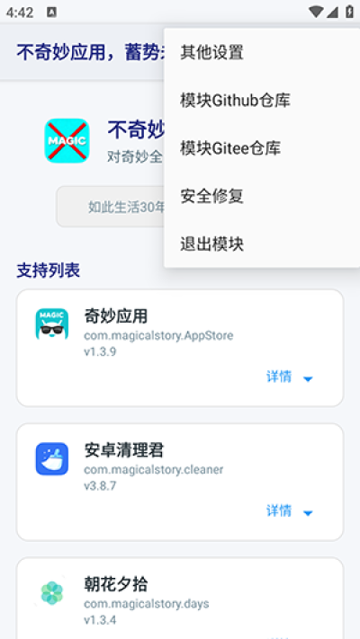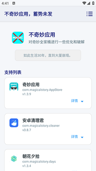 不奇妙应用APP是一款专为优化“奇妙应用全家桶”而设计的工具框架。它深度整合了包括奇妙应用、安卓清理君、朝花夕拾在内的多款实用软件,并提供了一系列增强功能:已解锁会员特权、彻底去除广告模块,带来更纯净、更强大的使用体验。应用界面干净清爽,操作逻辑简单直观,即便是新手用户也能轻松上手,强烈建议与模块管理器搭配使用。