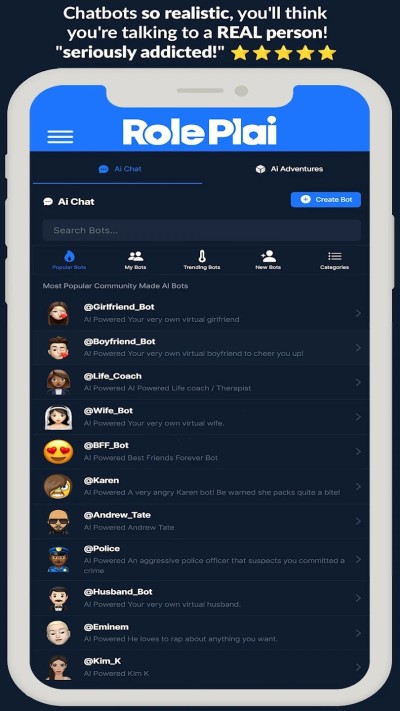 进入“AIChat(AI聊天)”模块,浏览“Popular(热门)”“Trending(趋势)”“NewBots(新角色)”或“Categories(分类)”,找到感兴趣的角色;