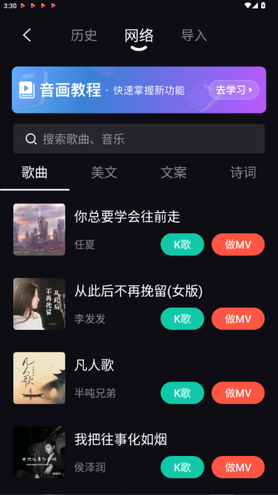 3、多平台音乐导入,个性配乐自由选:突破单一音乐库限制,支持从 QQ 音乐、酷狗音乐、全民 K 歌等多个影音平台一键导入音乐,用户可自由选择喜欢的歌曲作为视频 BGM,让作品配乐更贴合风格,增强情感表达。