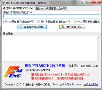 字符ASCII代码互查器是一款非常好用的可以查看字符的ASCII代码的字符编码转换器,也可以反着查询,输入字符,可以获取对应的ASCII代码(十进制或十六进制)。