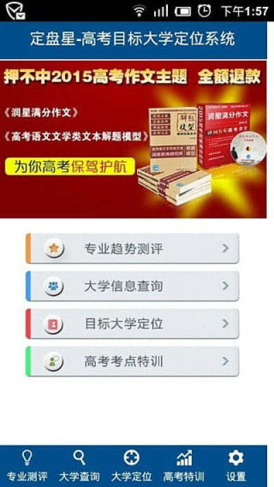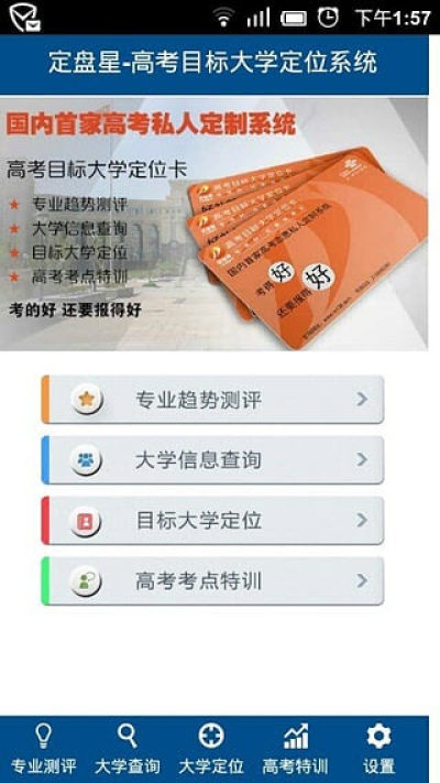 这款定盘星高考目标大学定位系统手机软件是专门为高考学子们开发的,其通过最专业分析为用户锁定适合的大学与专业,让你在志愿填报中能做出最准确的判断,有需要的朋友可以来下载体验一番!