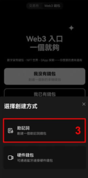 打开b圈app切换到 Web3 钱包首页进行「注册」,也就是建立一个属于自己的多链钱包,还没使用过去中心化钱包的话请选择以助记词方式建立,如果已经有冷钱包或是在其他地方例如 MetaMask 创过的话可以在第二步选择导入钱包。