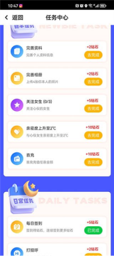 用户点击首页上方的日常任务可以进入到任务界面,完成任务可以获取许多钻石,获得的钻石可以用来和设置了付费聊天的朋友进行聊天。