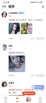 用户点击屏幕下方的动态,可以查看一下推荐朋友发布的动态,对喜欢的内容可以进行点赞关注,也可以点击博主头像发起视频、语言、文字聊天。