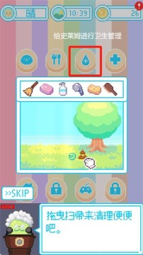 5、点击上方的水滴按钮就可以给史莱姆进行卫生管理,把便便清理干净后还需要使用扫帚清理哦。