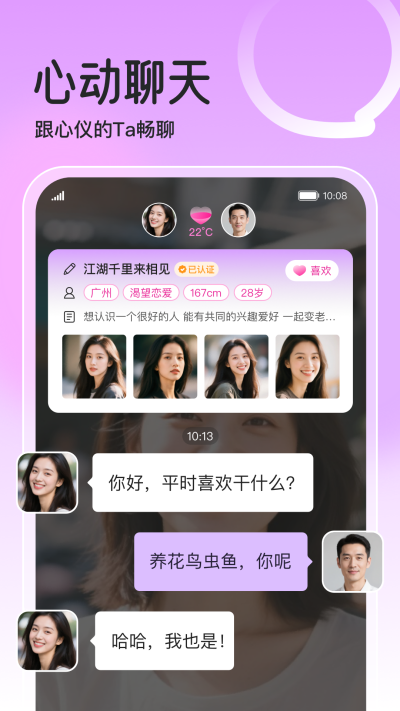 真人交友,精准匹配!在初念,每一次互动都是与真实灵魂的碰撞。我们坚信,好的缘分不该隔着屏幕猜测,而是能真切看见笑容、听见声音,最终在现实里靠近。海量有趣的真实用户,语音/视频等多种聊天方式,为你带来超棒的交友体验。